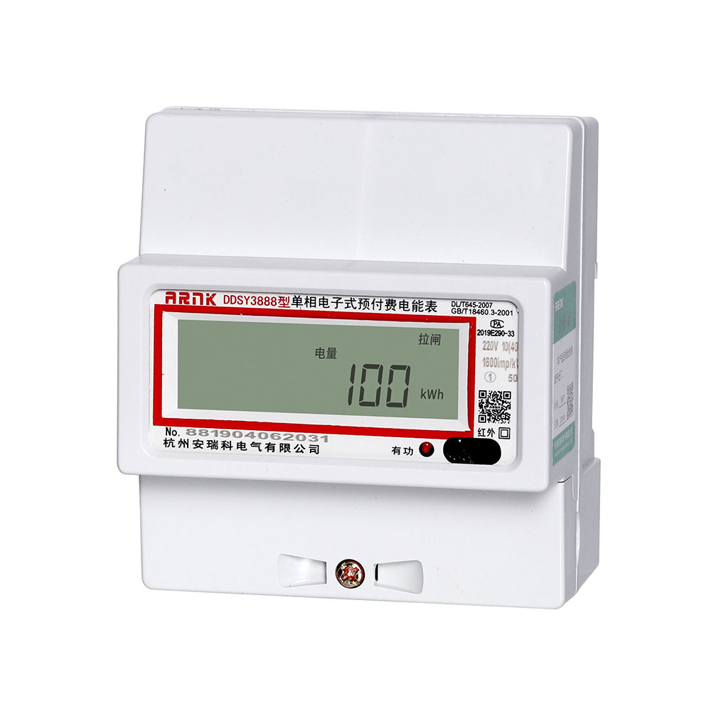 DDSY3888型单相导轨式电子式遥控预付费电能表(红外费控电能表)是具有电能计量、负荷控制和体积小、安装方便等多种功能的新型红外无线遥控预付费电能表,是当前改革用电体制、实现电能商品化、解决收费难及调节电网负荷状态的理想产品。