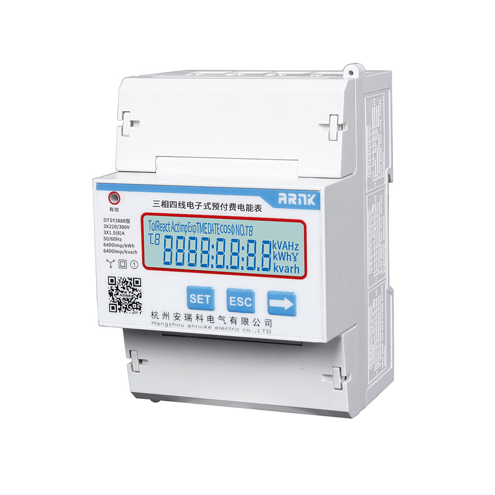 三相四线(新型导轨式)多功能电能仪表(预付费)(以下简称电能仪表),是为了适应电网改造设计开发的导轨式有功多费率预付费电能仪表。它具有较高的准确度和可行性。三相静止式电能表技术要求,是变电站或电厂理想的选择,亦适合输配电或配网自动化用表。本产品可供计量参比频率为50Hz电网中的三相交流有功电能,并能进行正、反向电能计量和红外及RS485通讯功能。其特点是精度高、可靠性好、宽负荷、低功耗、误差曲线平直、抗干扰能力强、体积小、方便安装。该仪表具有红外及RS485购电功能。